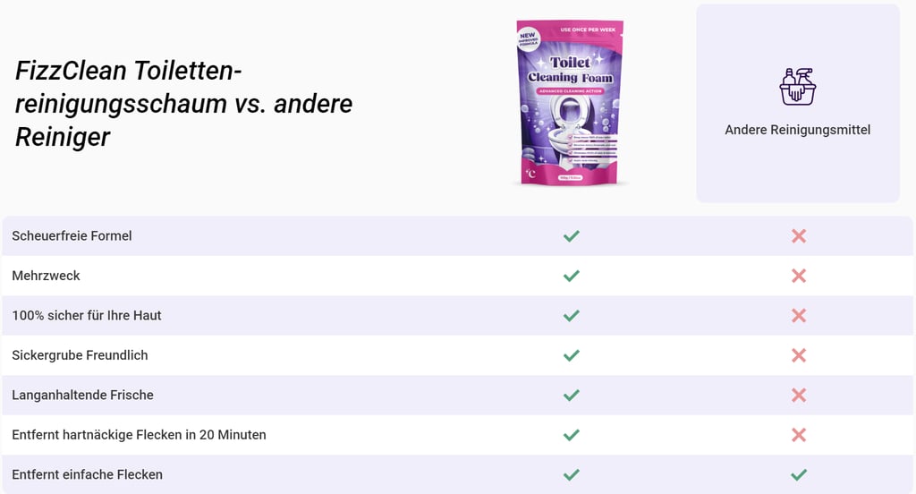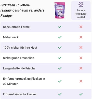 Warum sollten Sie die Reinigung Ihrer Toilette zu einer lästigen Pflicht machen? Mit FizzClean brauchen Sie nicht mehr zu schrubben, sich zu bücken oder sich dem Schmutz zu nähern. Gießen Sie einfach ein, warten Sie und lassen Sie die fortschrittliche Tensid-Schrubbtechnologie die ganze Arbeit für Sie erledigen. FizzClean ist die Zukunft der mühelosen Reinigung und lässt herkömmliche Reinigungsmittel der Vergangenheit angehören.